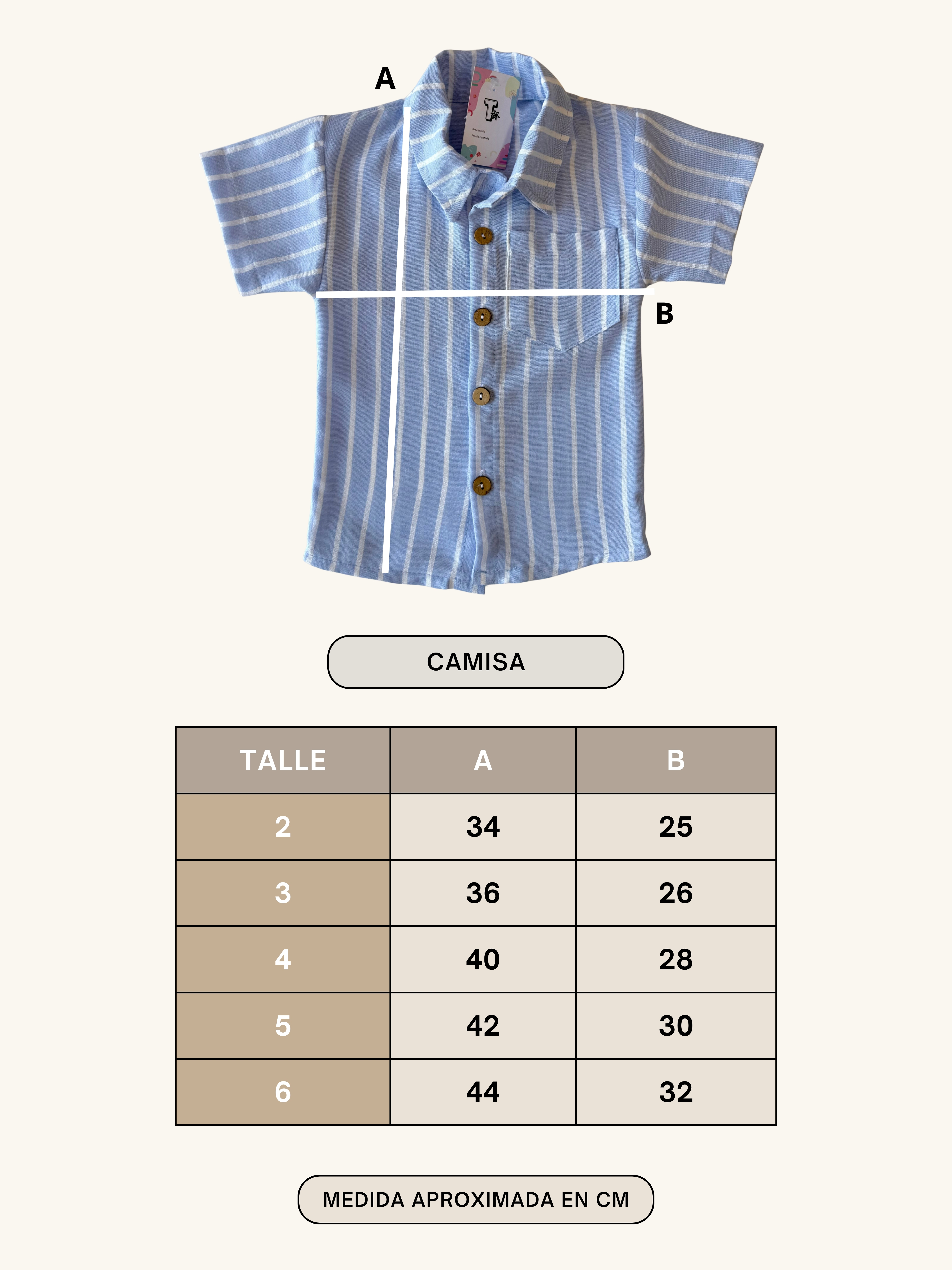/ Agarrá una camisa que le quedé perfecto a tu bebé, medilo y compara las medidas con nuestra tabla de talles para saber cual es el indicado.