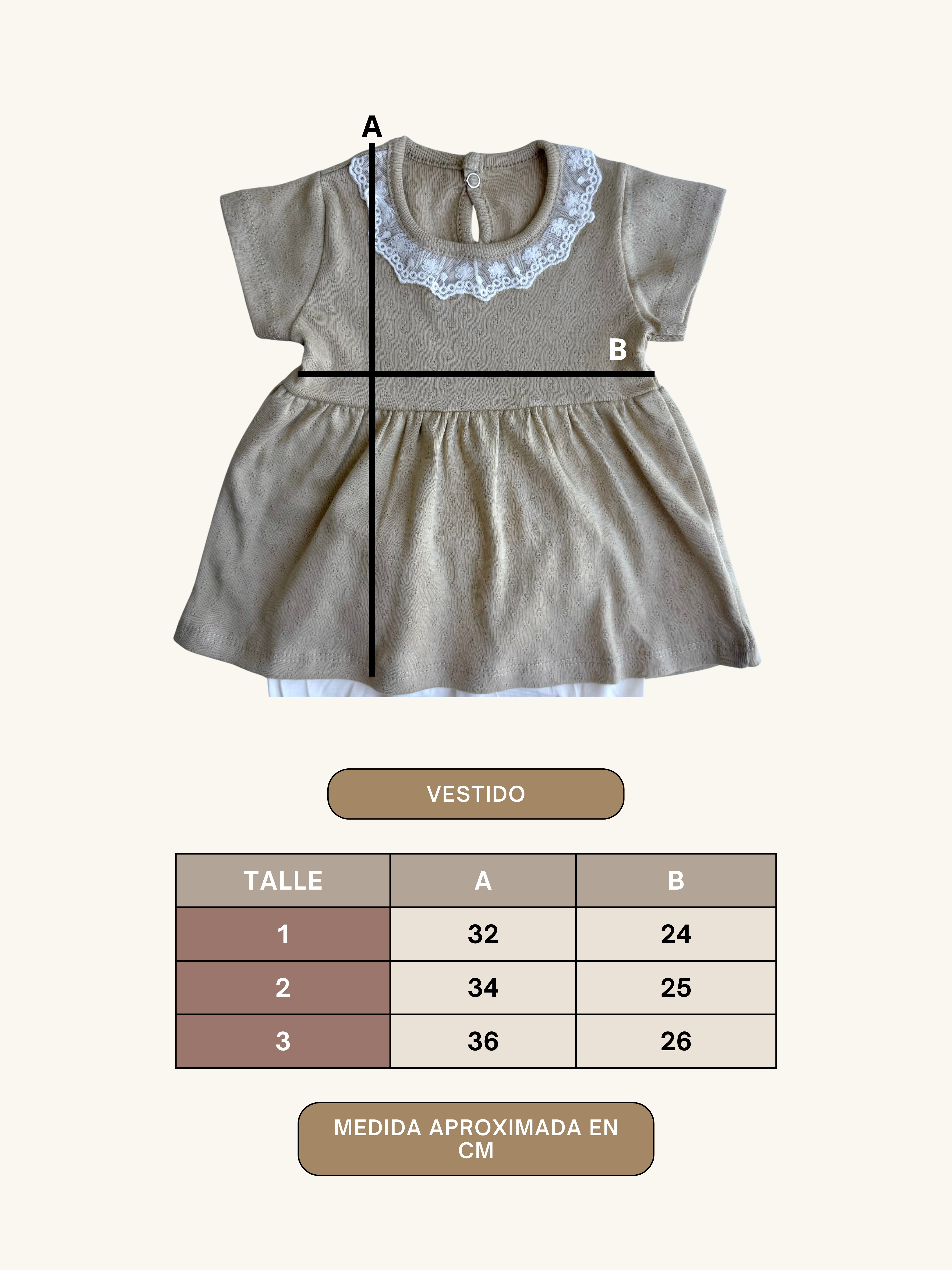 / Agarrá un vestido que le quedé perfecto a tu bebé, medilo y compara las medidas con nuestra tabla de talles para saber cual es el indicado.
